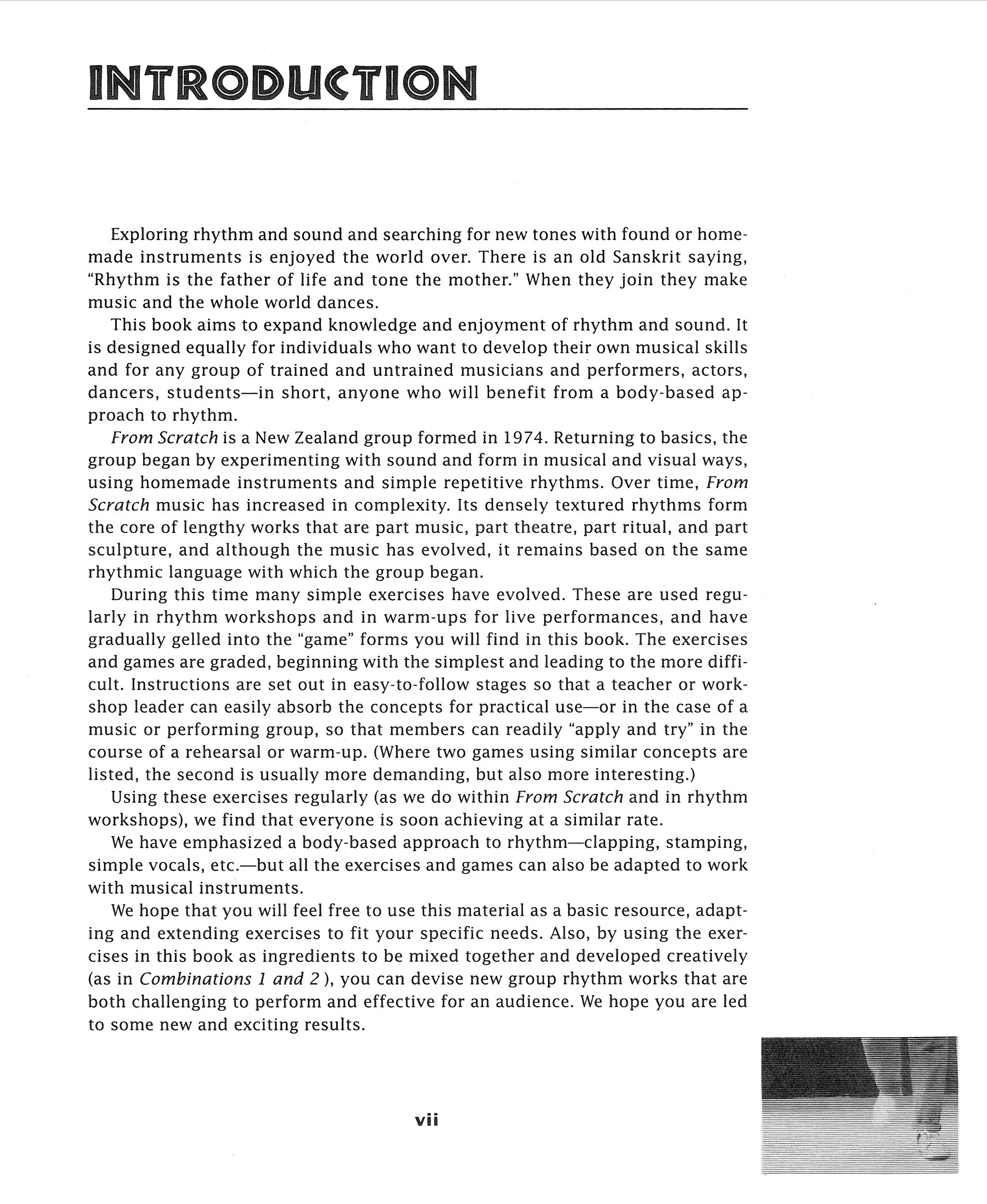 From Scratch is experienced in giving in-depth workshops which deal with music making, performance and instrument-making procedures characteristic to the group. Phil Dadson is co-author of the From Scratch Rhythm Workbook, a hands-on manual of rhythm games and exercises designed to develop individual and group rhythm skills. The exercises are aimed at all kinds of performers and develop from a body-based approach - simple foot stepping, clapping and vocals - to sophisticated work with instruments and extended movement.